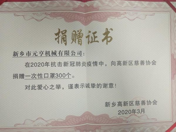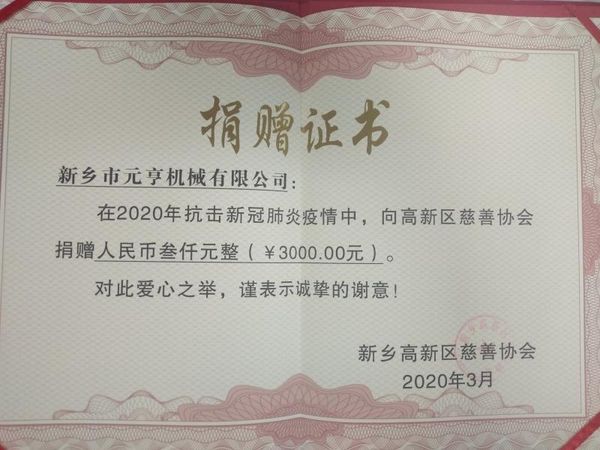 新鄉(xiāng)市元亨機械有限公司,自2004年建廠十多年以來,積極投身社會公益事業(yè)中來,這次疫情到來之際,我們**時間向當?shù)丶t十字會捐款捐物,為疫情的控制盡我們企業(yè)自己的一份力。
