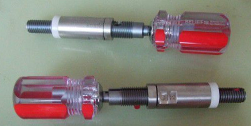 鋼絲螺套在安裝過程中出現(xiàn)問題需要取出,應當使用專用鋼絲螺套取出工具---卸套器,將卸套器放入鋼絲螺套孔內,對準手柄用榔頭猛擊一下,用手加力按下手柄反螺紋旋轉即可取出鋼絲螺套。