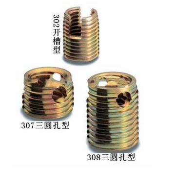自攻螺套為一種帶開槽或開孔的自攻型螺紋嵌入件,其中開槽型自攻螺套被推薦應(yīng)用于大多數(shù)應(yīng)用領(lǐng)域。在某些材料上,這種螺套提供完美的特定螺紋鎖功效。如果還不行,一般推薦使用 307/308型,307/308型在材料切割困難方面做出了重大的突破。這種產(chǎn)品不但有很厚的壁,還有三個具有切削能力的圓孔分散于壁上,307/308產(chǎn)品特別適用于材料厚度不太寬裕的情況下。