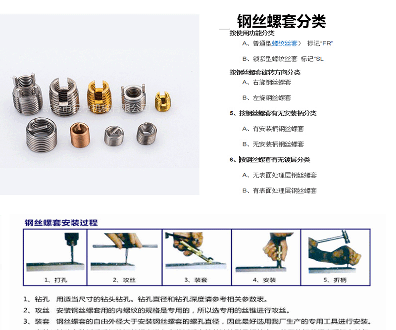 鋼絲螺套在安裝后,一般通孔都要求將尾柄去除掉,具體方法是用沖斷器對準安裝柄,用200g的榔頭猛打一下,即可去除,對于18X2.5以上的粗牙絲套和14X1.25以上的細牙絲套,用尖嘴鉗上下彎曲安裝柄就能折斷。