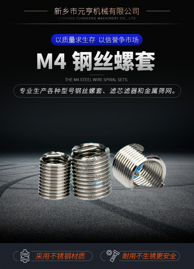 M4鋼絲螺套是一種新型的內(nèi)螺紋緊固件,適用于螺紋連接,旋入并緊固在被連接件之一的螺紋孔中,形成標(biāo)準(zhǔn)內(nèi)螺紋,螺栓(或螺釘)再擰入其中,又名螺紋絲套,簡稱絲套。它是用高強(qiáng)度、高精度、表面光潔的冷軋菱形不銹鋼絲精確加工而成的一種彈簧狀內(nèi)外螺紋同心體,主要用于增強(qiáng)和保護(hù)低強(qiáng)度材質(zhì)的內(nèi)螺紋。鋼絲螺套特點(diǎn):1、鎖緊型鋼絲螺套能把螺釘鎖緊在螺紋孔中,在經(jīng)受沖擊振動(dòng)時(shí)使螺釘不至于松扣,比通常鎖緊裝置的工藝性能好。2、與鑲嵌鋼質(zhì)或銅制襯套方法相比,在同樣強(qiáng)度條件下,可選用尺寸較小,強(qiáng)度較高的螺釘,這樣可縮小體積,減輕重量。3、鋼絲螺套的硬度比螺釘高,因此在與螺釘連接裝拆過程中磨損小,可反復(fù)使用。據(jù)有關(guān)試驗(yàn)研究,鋼絲螺套抗拉強(qiáng)度是螺釘?shù)?倍以上,因此在螺釘斷裂情況下鋼絲螺套也不會(huì)損壞。