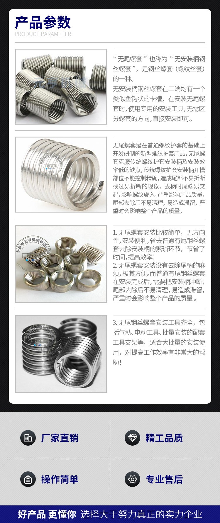 簡易螺紋護(hù)套安裝工具有螺紋頭、光桿兩種。用于少量安裝,一般維修、實(shí)驗(yàn)時用,操作時不易安裝,鋼絲螺套容易報(bào)廢。
