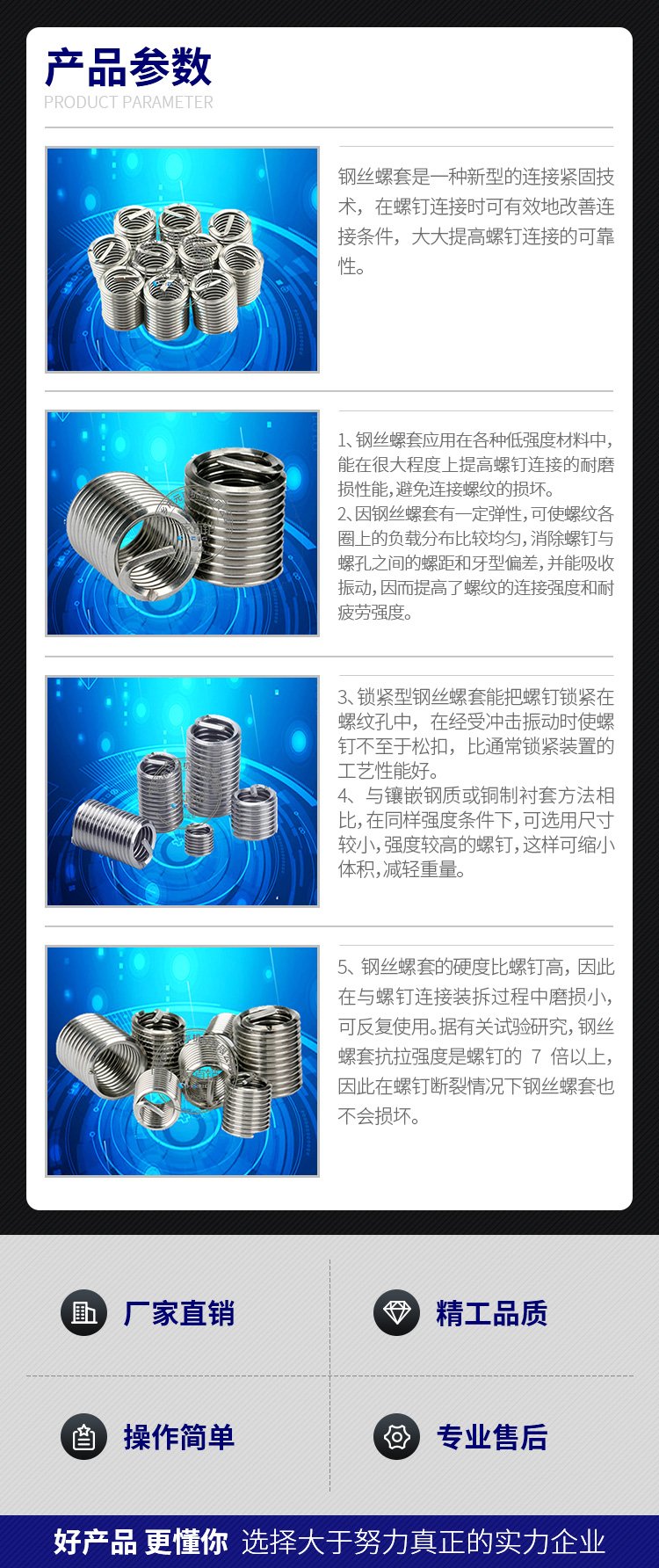 簡易螺紋護(hù)套安裝工具有螺紋頭、光桿兩種。用于少量安裝,一般維修、實(shí)驗(yàn)時(shí)用,操作時(shí)不易安裝,鋼絲螺套容易報(bào)廢。