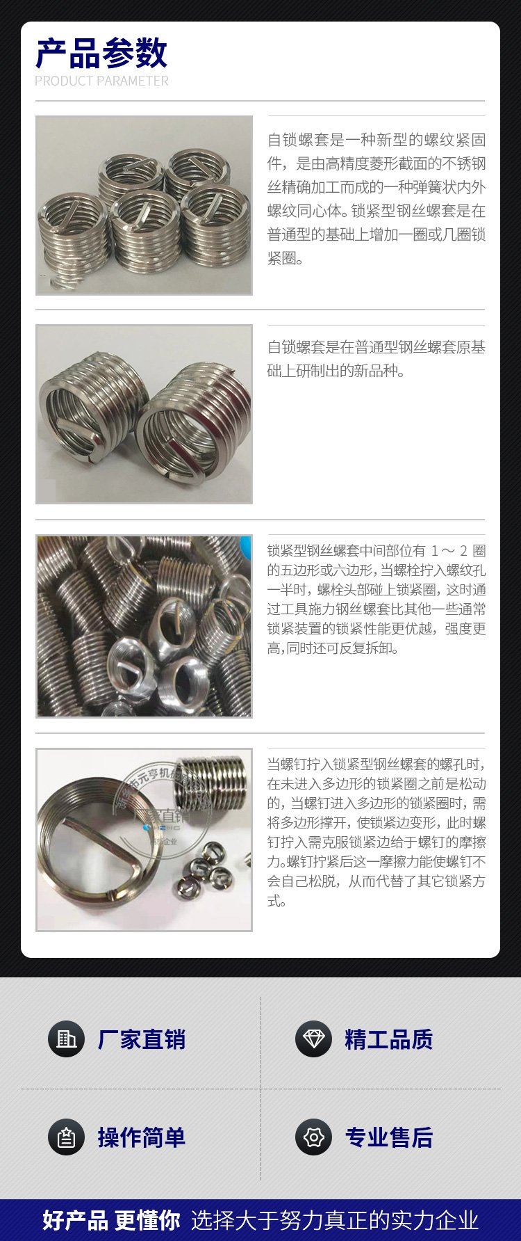 簡(jiǎn)易螺紋護(hù)套安裝工具有螺紋頭、光桿兩種。用于少量安裝,一般維修、實(shí)驗(yàn)時(shí)用,操作時(shí)不易安裝,鋼絲螺套容易報(bào)廢。
