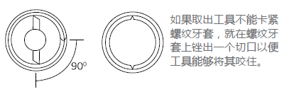 正確的放置位置能夠使拆卸變得更加容易,因此工具應(yīng)從螺牙開始部分轉(zhuǎn)動(dòng)90°,使其能夠從螺紋牙套中很容易地旋出。